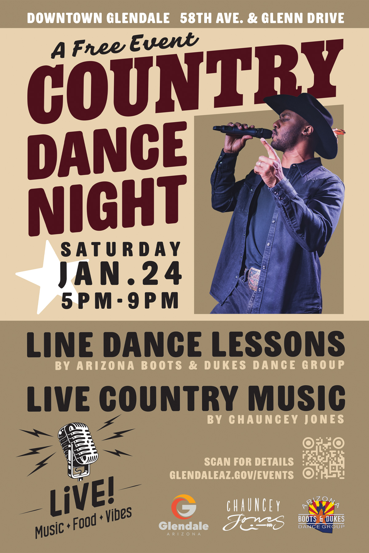 From 5:00 p.m. to 9:00 p.m., guests are invited to gather at 58th Avenue & Glenn Drive for an outdoor concert featuring live country music from Chauncey Jones and free line dancing lessons led by AZ Boots & Dukes. Whether attendees are seasoned dancers or beginners, the lessons are designed to be fun, welcoming, and easy to follow.