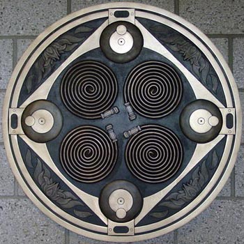 The Glendale Arts Commission, in partnership with the Fire Department, selected Gregg LeFevre of New York, NY to create artwork for the new fire station located near 63rd Avenue and Bell Road. Mr. LeFevre has created four large bronze medallions that feature fire fighting equipment such as hoses, axes and pike poles. From a distance, the medallions appear as abstract designs and their circular shape compliment the angular lines of the station's architecture. Two medallions are placed in the interior lobby and two are placed on the exterior wall.