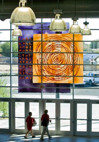 The Glendale Arts Commission, in collaboration with the Parks and Recreation Department and ART Architects, selected Gordon Huether of Napa, CA to create an artwork for the main entrance of the new Foothills Recreation & Aquatics Center. Go, Go, Go is made of etched and laminated mouth-blown glass imported from Waldsassen, Germany. The piece is composed of 19 panels and spans the entrance at approximately 14 feet by 16 feet. The imagery features hand-drawn international sports symbols that represent the various activities at the Center. The Glendale Arts Commission released a nation-wide call to artists in the spring of 2005. 65 applications were received. Mr. Huether's design was approved by a selection panel, the Glendale Arts Commission and the City Council in the fall of 2005. The artwork and facility were dedicated on September 30, 2006.