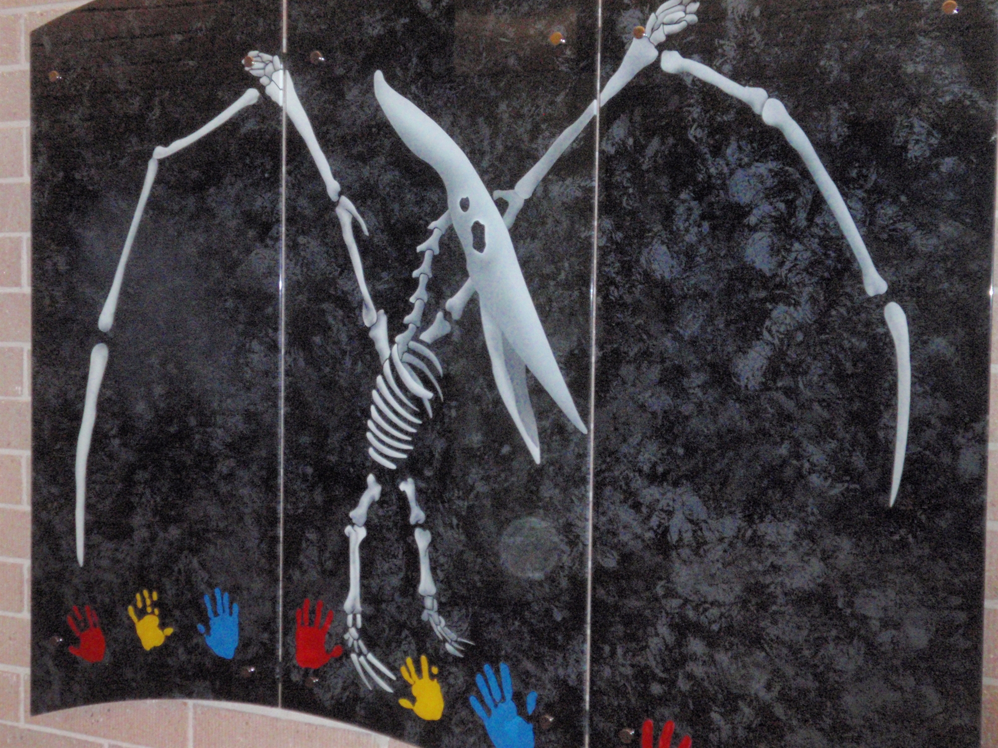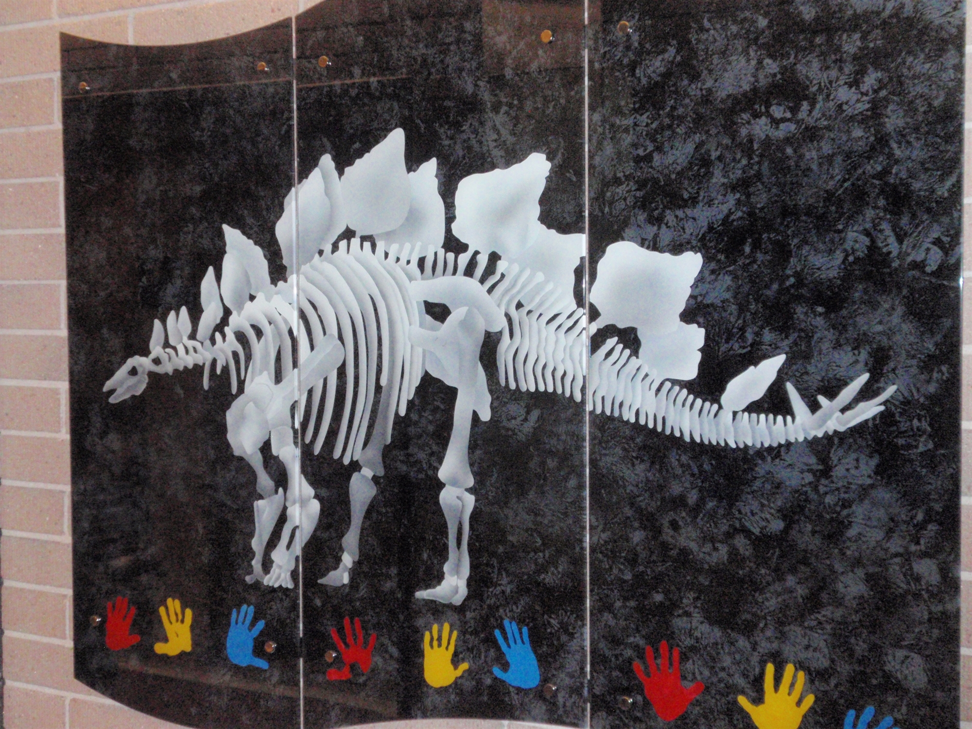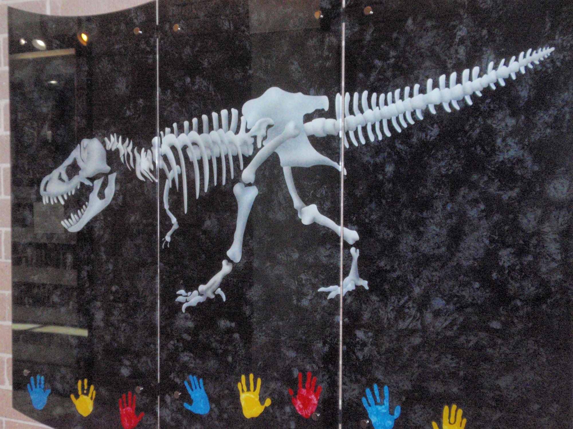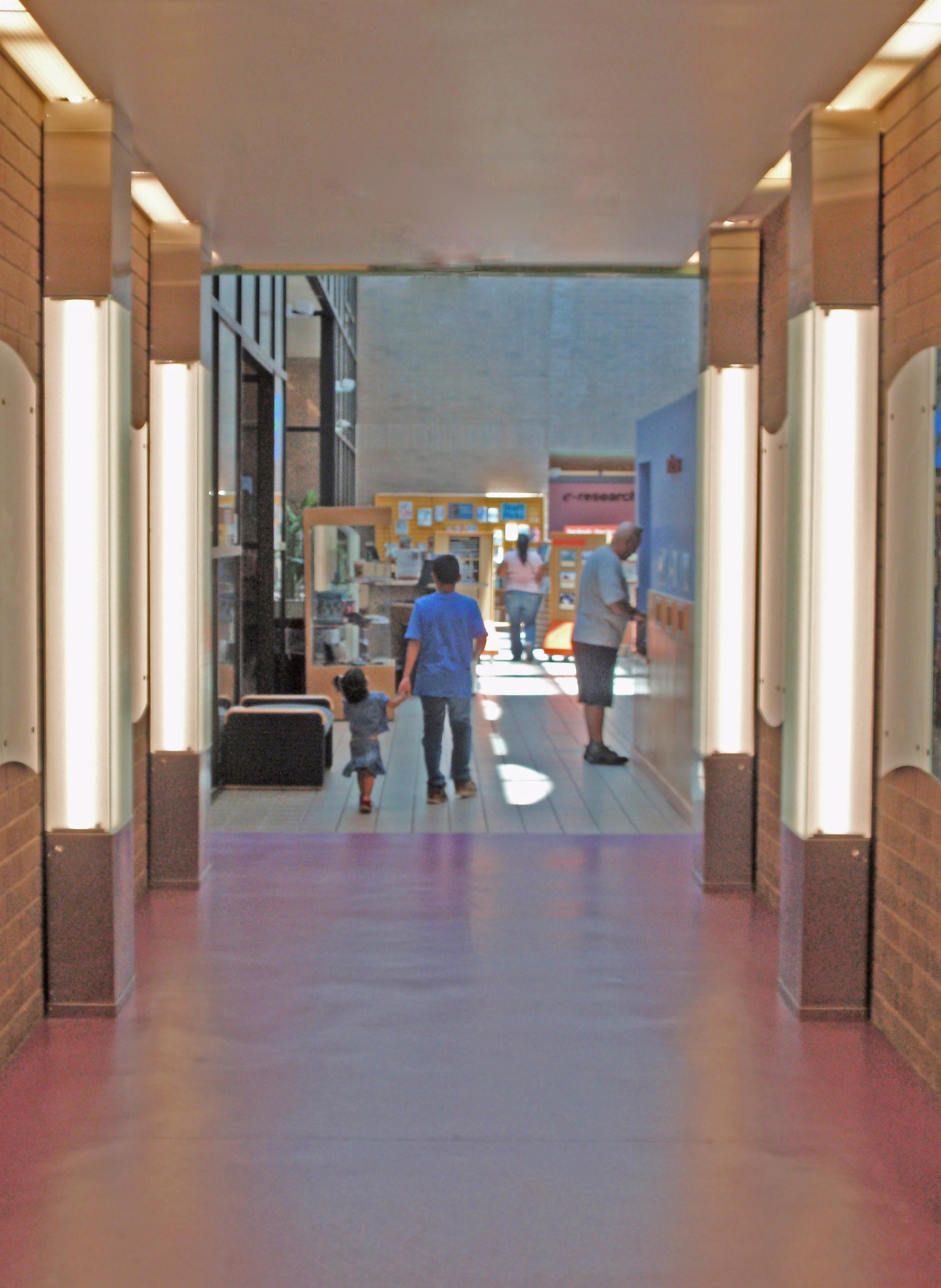 Lighting the ages for the Main Public Library was a project that involved lighting a corridor connecting the main portion of the library with the youth section. The work needed to bring light into the dark corridor and also be something the children could enjoy. Using images of dinosaurs, handprints from children who frequent the library, and Braille as a design element on the lighted columns was the way to accomplish the intent. The Braille is raised on the surface of the glass and can be enjoyed by those with limited or no vision as well as those who have standard sight. The dinosaurs are exciting for the children who walk through the corridor and the hand prints encourage the children to touch the glass.