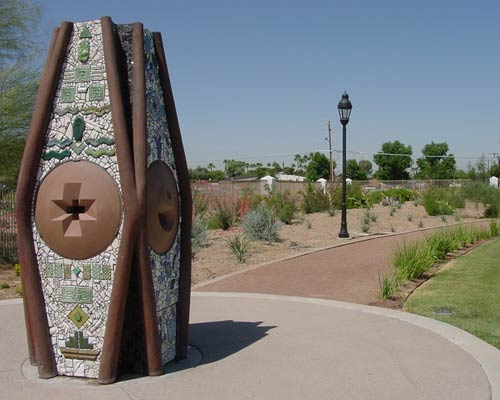 The garden contains five points of interest; the Wisdom Garden, the Celebration Garden, the Contemplation Garden, the Reflection Garden and the Story Totem Garden. As part of the Story Totem Garden, Seeing Beyond brings the visually impaired and sighted person to a common ground as they share the experience of enjoying art on many levels. The four cutout shapes, on each side of the sculpture, represent archetypal symbols found in cultures worldwide and reveal universal patterns of perception.