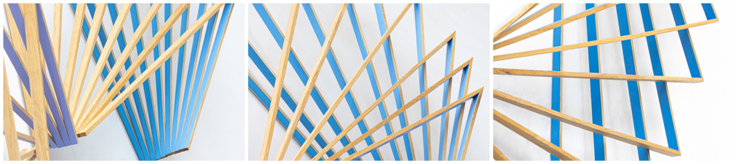 Three Arcs consists of three separate units made from oak. All of the units are based on the same repeating two-point system, with dimensional variations. The colors that appear on the inner aspects of each unit change slightly as they are viewed from different positions.