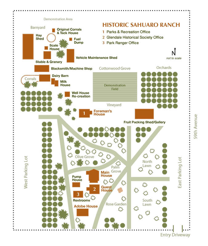 During 1995-1996, major restoration began on the Main House, Fruit Packing Shed, Foreman’s House and other historic structures. The most recently completed restoration was the porch for the Main and Guest Houses, which were dedicated in 2004. Future capital improvements include a barnyard building for storing collections and staging special events and a visitor center near the park entrance. Major funding for restoration of historic sites came to the city through matching grants from the Heritage Fund, Arizona State Parks.